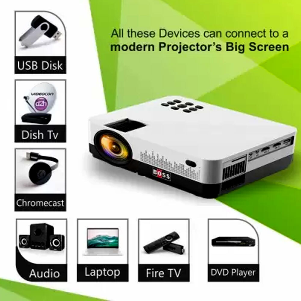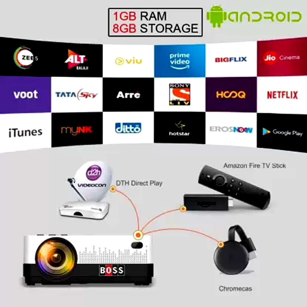 Boss Latest Model BOSS S13A FHD 3D Android Wi-Fi Bluetooth Smart Projector Has Powerful 4000 Lumens With 1920X1080p Resolution. Smart Android Projector, the latest TV version android system. Built-in Google play store, download and install more than 5000+ apps directly from Google Play Store Pre-installed Netflix, Youtube, Chrome etc. Directly install apps such as Prime video, Hotstar etc In Boss S13A. Dual channel Wifi (2.4Ghz and 5Ghz) and Bluetooth 5.0 for interruption free Audio video streaming. These all features comes with a unique Keystone & Zoom In & Zoom Out Feature. Bigger - 250" Large Display Watch your favourite movie on a theater like large screen at the leisure of your home. FULL HD 1920X1080P Native Display Immersive Dolby Digital Plus Sound with large integrated sound chamber and 2x10 Watt speakers. 40-250 inch projection area Contrast Ratio : 4000 : 01 More than 60000 hours of Lamp life OS: Official Google Android 8.0 Memory: RAM 1 GB, ROM 8GB All the content that you love, exactly how you want it. Welcome to a smarter way to watch. Whatever you're into—from Hotstar, Netflix, SonyLiv to YouTube to tons of games—there's an app you're sure to love. No Ultra Violet rays from Boss Projector. Support 3D: Available red-blue 3D Glasses to watch Red-blue Film source 3D Movies. 1 Year Brand Warranty And 60,000 Hours Life, Pickup And Drop Facility Also Available.